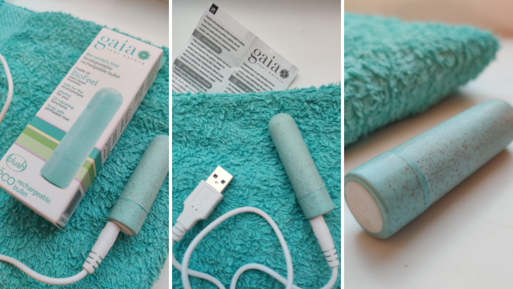 Uit de enorme bezorgdoos komt een kleine maar elegante vibrator tevoorschijn. Het pakketje bestaat uit de vibrator, USB-oplaadkabel en mini gebruiksaanwijzing over het opladen. De vibrator is mintgroen met een subtiel stipjes patroon, een kleur die mij erg aanspreekt. Het formaat van de vibrator is echter zo klein dat deze mij de associaties van een tampon geeft. Maar dan wel een elegante met een prachtige kleur! Fijn dat de Gaia vibrator een USB-kabel heeft. De afgelopen jaren heb ik heel wat aangerommeld met kleine vibratoren en diverse soorten batterijen. Vervangbaar door de achterkant van het speeltje open te draaien. Klinkt simpel, maar zorgt in de praktijk voor veel gerommel: de juiste batterijen vinden en daarnaast: hygiëne… je blijft de randjes en kieren schoonmaken.
