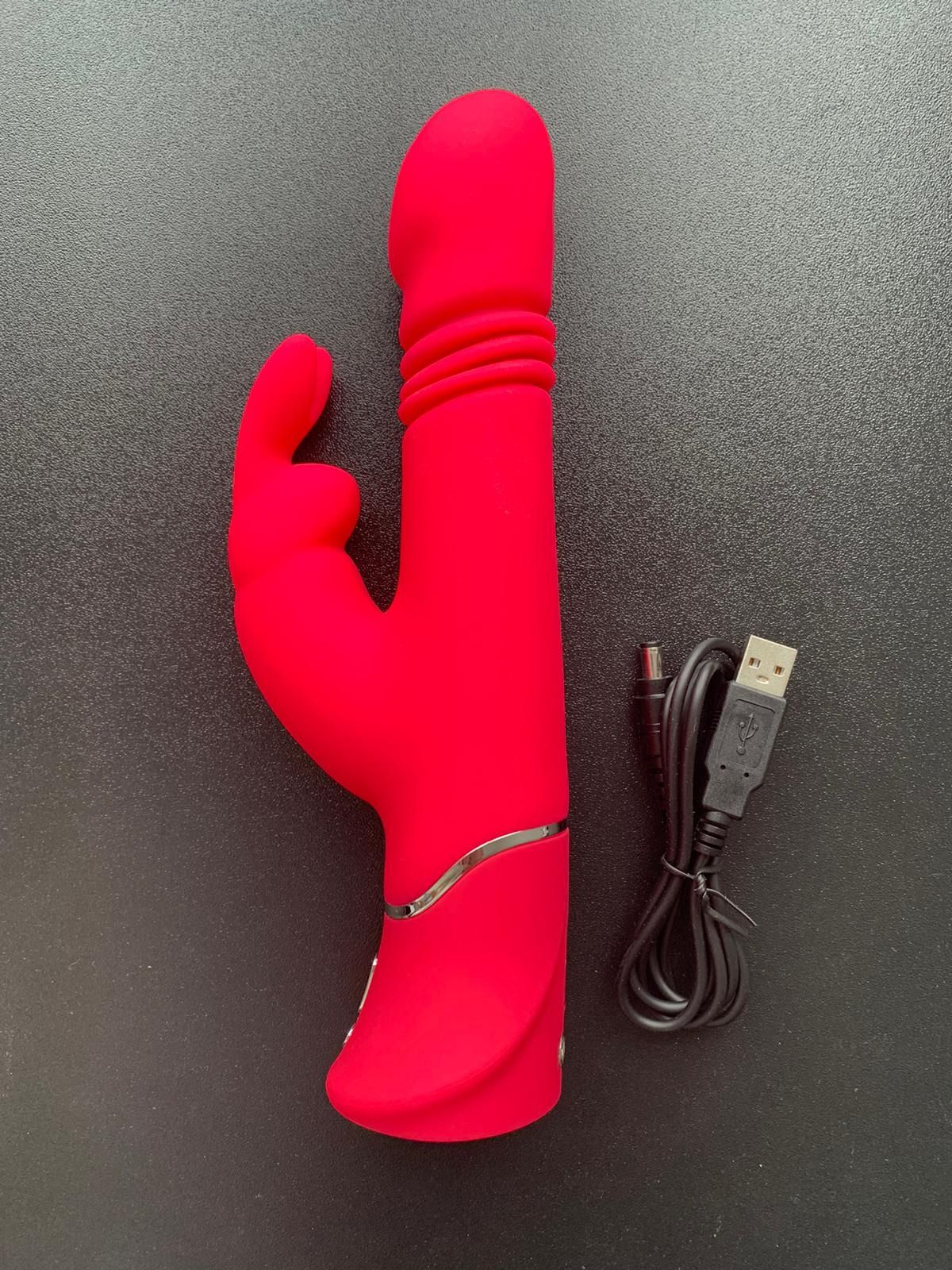 Om de vibrator te kunnen gebruiken dient deze opgeladen te worden middels de meegeleverde USB-stick. Dit gaat gemakkelijk. De toy is gemaakt van siliconen en is 22,7 centimeter lang. De invoerdiepte van het stotende deel is ongeveer 12,5 centimeter. De vibrator heeft twee verschillende motoren, één voor het stotende deel en één voor de trillende ‘konijnoortjes’. Het stotende deel heeft drie standen en deze gaat aan door kort op de grote knop te drukken, je wisselt tussen de standen door telkens kort op de grote knop te drukken. Het stotende deel gaat uit door lang op de grote knop te drukken. De vibrerende konijnoortjes gaan aan door op het kleine knopje te drukken, wisselen tussen de standen werkt ook door op het kleine knopje te drukken.
