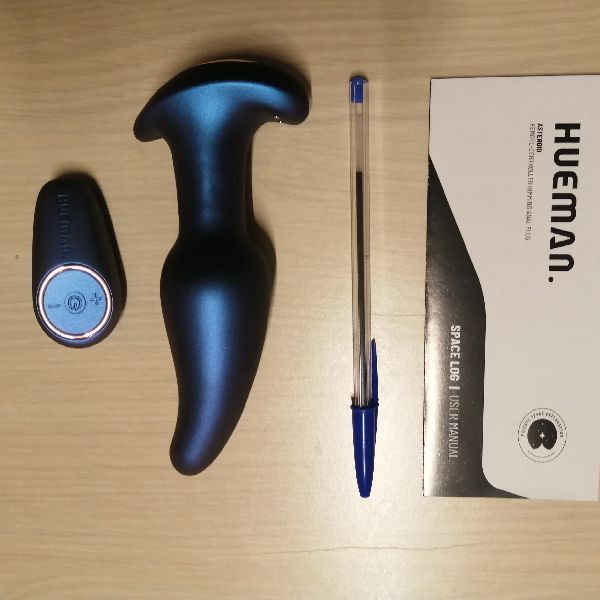 Elke keer schrik ervan hoe snel de pakketjes geleverd worden. Na 1 of 2 dagen staat de postbode aan mijn deur met op het eerste zicht een onschuldige pakketje. Zonder reclame op de doos weet ik toch al wat er me te wachten staat. In deze doos zit weer een leuke ontdekking, maar niemand die dit weet… In de anonieme verzenddoos zit er een aantrekkelijke, zilveren verpakking. Op de doos zelf staat de basisinformatie om met deze anaalplug aan de slag te gaan. Ongeduldig maakte in de doos open, maar ik werd nog wat langer in spanning gehouden. In de doos zat namelijk een zilveren pakje en de uitgebreide handleiding. Het zilveren pakje deed ik natuurlijk meteen open en daar was ie dan: de asteroïde rimmende anaalplug van het merk Hueman met bijhorende afstandsbediening en oplaadkabel. Wat mij meteen opviel, was het knappe design. Ik heb nu al enkele speeltjes gezien, maar deze ziet er echt professioneel uit. De speciale blauw-paarsachtige kleur geeft het iets heel stoers. Ook de afstandsbediening ziet er echt knap uit. Dit is een nieuwe generatie van kwalitatieve speeltjes.