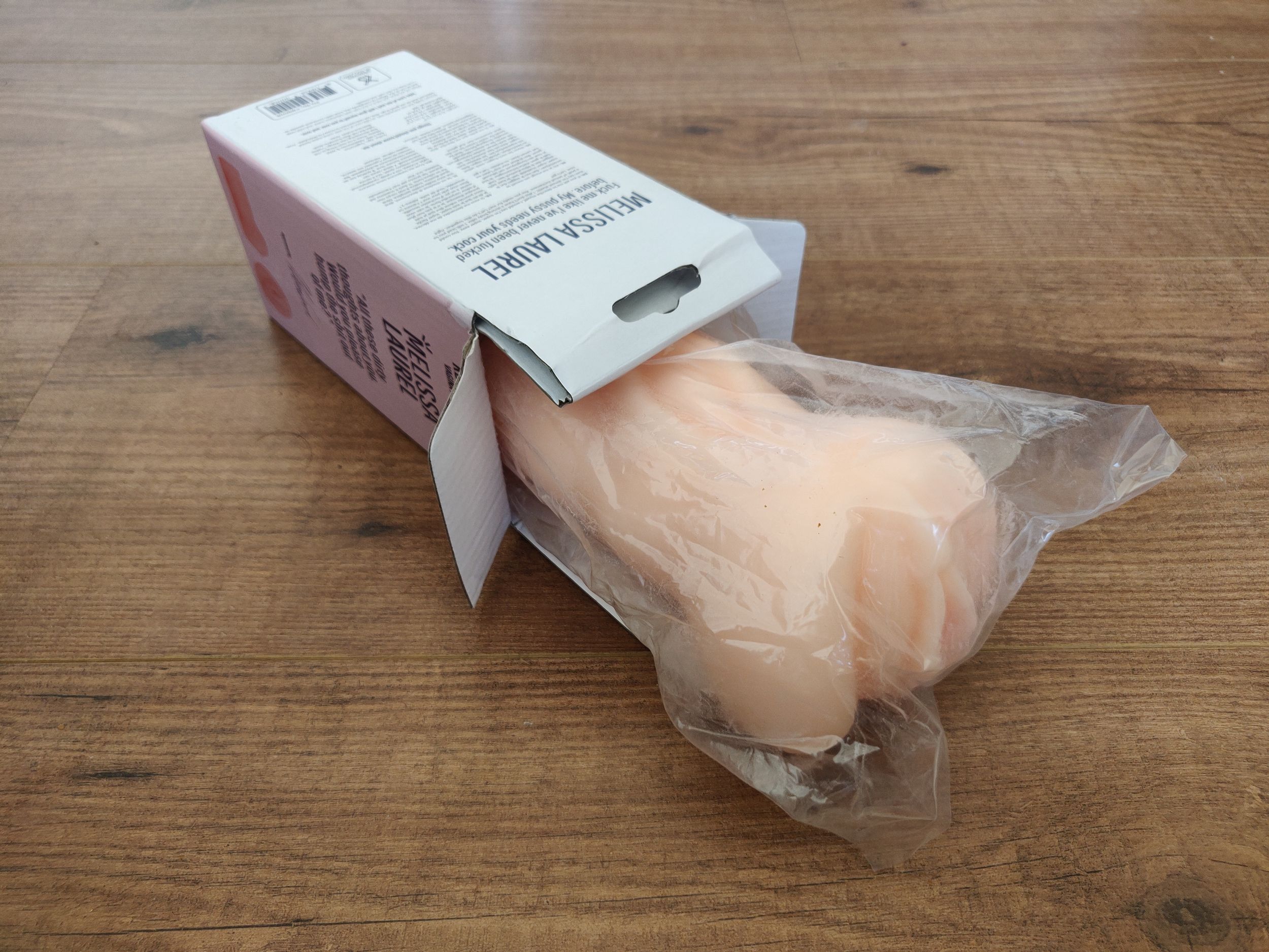De verpakking was precies groot genoeg om de masturbator te bevatten. In tegenstelling tot de kleinste modellen van deze collectie, die een lengte van 13 cm en een interne lengte van 10 cm hebben, is deze masturbator met zijn lengte van 15 cm en interne lengte van 11 cm net ietsjes groter, al rekt het materiaal ietsjes mee waardoor de interne lengte uitrekt tot zo’n 13 cm. Vaak komt het voor dat deze pocket pussies een stukje stabiliteit of stevigheid missen, iets waar een toy als de Fleshlight voor compenseert door een hard-plastic houder, maar doordat de Melissa Laurel een gewicht van 500 gram heeft is daar in dit geval geen sprake van. De geur is een beetje vreemd zoet en heeft daarom niet mijn voorkeur, maar omdat deze niet heel sterk is heb ik er geen last van gehad. Het materiaal (TPE) is heerlijk zacht en de schaamlippen hebben gematigd detail, maar er was wel gekozen voor een bijzonder kleine en krappe opening, waarvan al snel zou blijken of dat een goed idee was of niet.