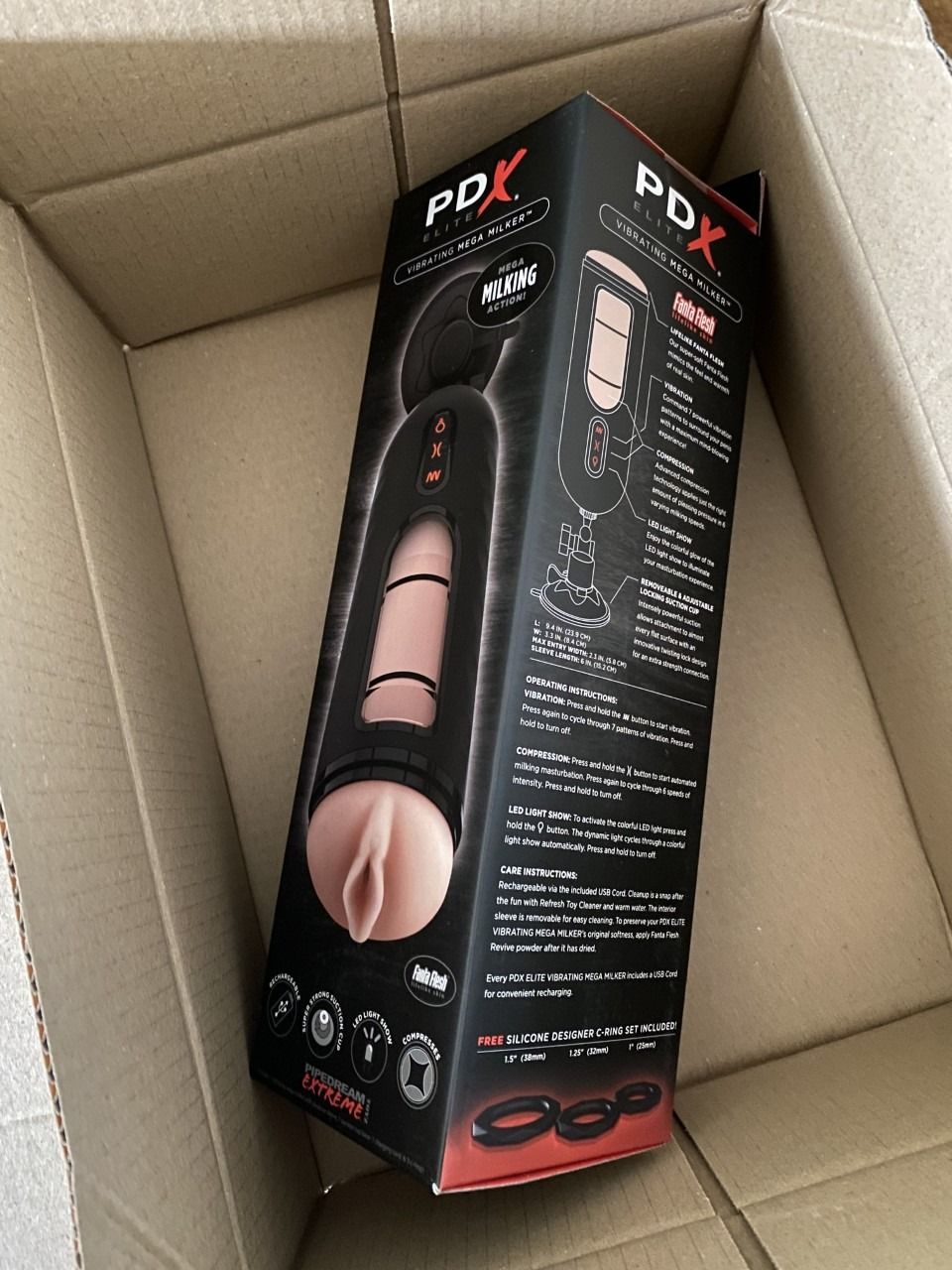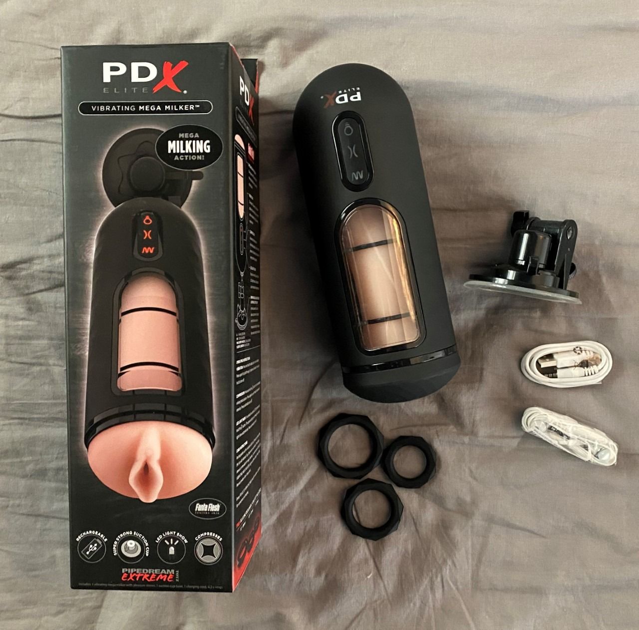 De PDX Elite Vibrerende Mega Milker Masturbator is een intense masturbator met vele mogelijkheden en soms ook nutteloze extra’s. Zo is het discolampje eigenlijk alleen maar een leuke gimmick en is de kreunende vrouwenstem fouter dan fout en totaal overbodig. Nadelen zijn onder andere het harde geluid als de milking stand aanstaat, wat lastig kan zijn als je huisgenoten hebt. Verder mis ik een “rustige” stand bij de milker en ook het schoonmaken is wat lastiger door het gebrek van een gat onderaan de sleeve. Voordelen daarentegen zijn de sterke zuignap, welke alle keren dat ik de toy heb uitgetest netjes bleef plakken aan de muur en de 3 cockringen die je er gratis bij krijgt. Met name dat laatste is een leuke touch en hoewel ze niet van de beste kwaliteit ooit zijn is het wel tof dat ze erbij zitten.