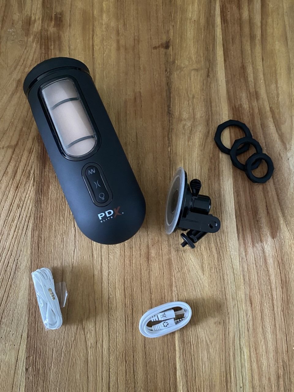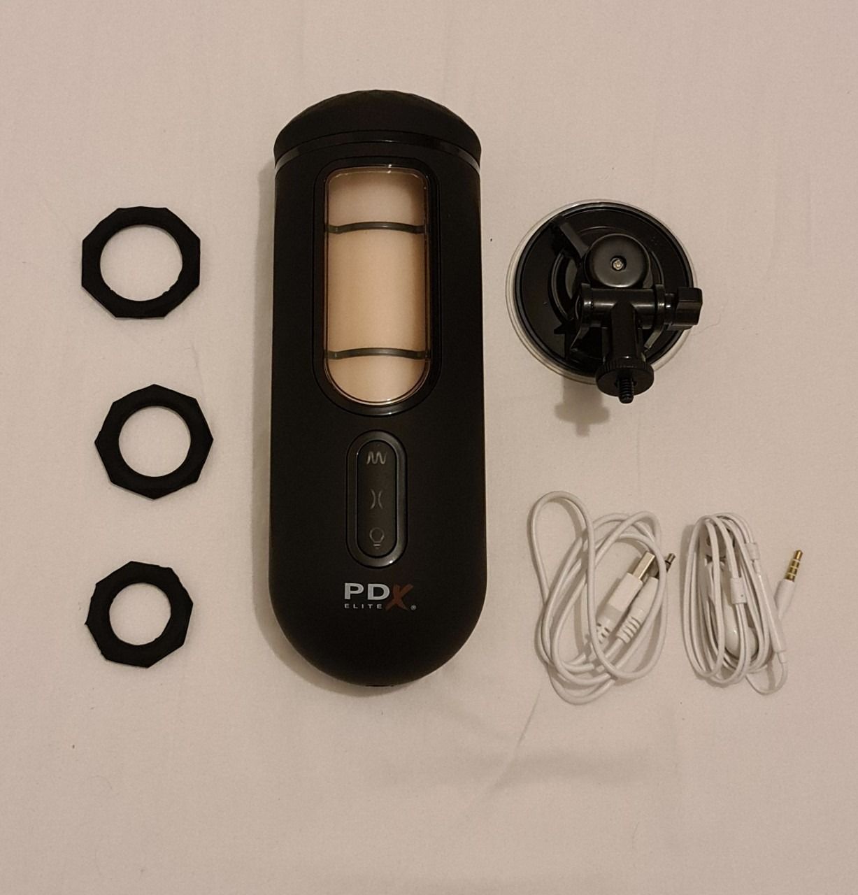 Naast de masturbator zit er ook een sterke zuignap in de verpakking, welke je zo te zien gemakkelijk kan verstellen en vastdraaien aan de toy. Ook krijg je 3 siliconen cockringen bijgeleverd, welke een diameter van 25, 32 en 38 mm hebben. Opladen doe je met het bijgeleverde USB kabeltje, welke je aan de achterkant kan inpluggen. Last but not least krijg je ook nog een paar witte oortjes meegeleverd. Hmmn… Suspicious! Waar die precies voor zijn? Stay tuned!????