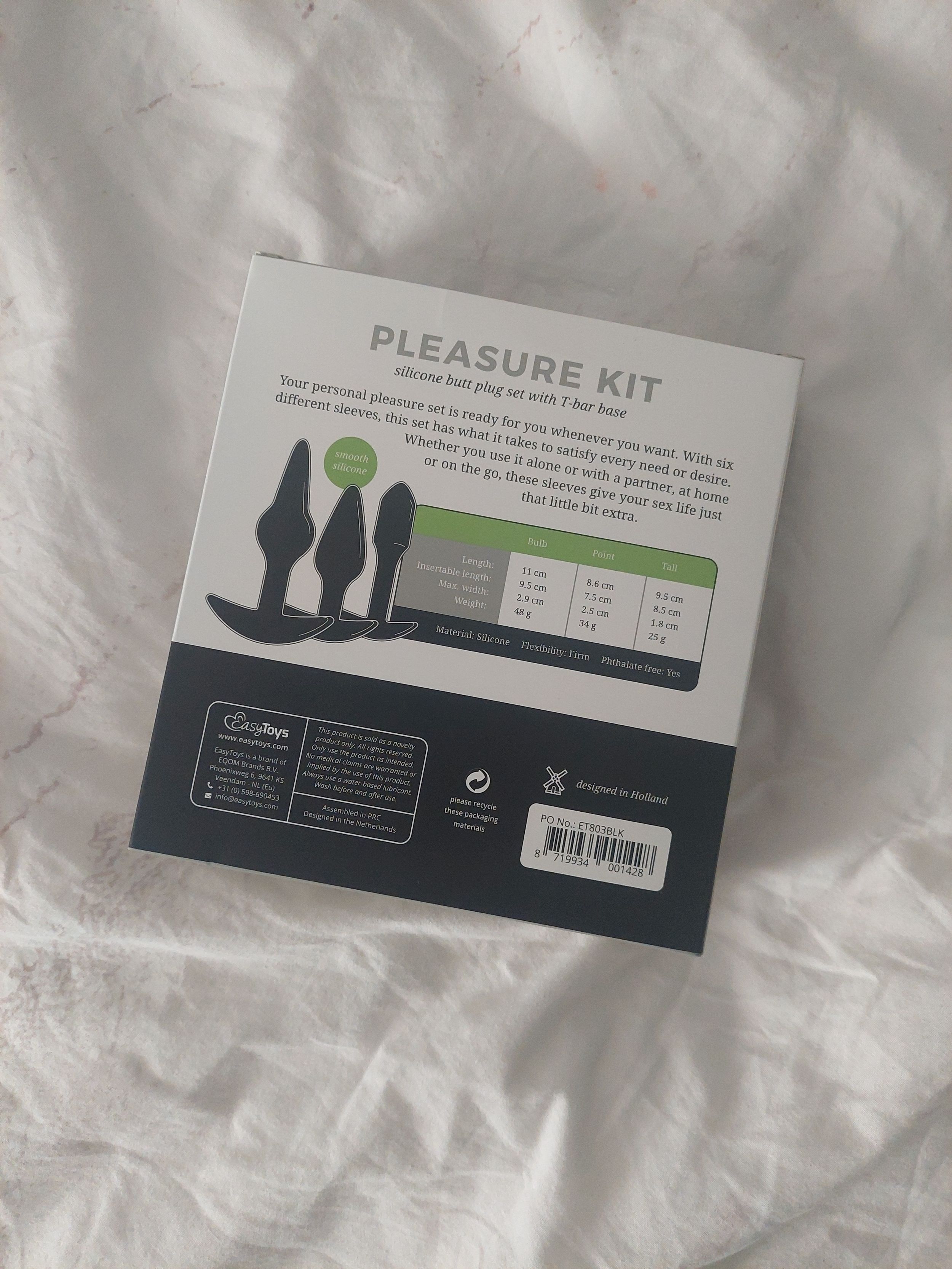 Hou jij van anale stimulatie of wil je het graag eens proberen om te kijken of het iets voor je is? Dan is de Pleasure Kit buttplug set zeker iets voor jou! De buttplugs hebben verschillende formaten, zodat je bij de kleinste kan beginnen en op je eigen tempo naar de grootste toe kan werken. De plugs zijn gemaakt van zacht en flexibel siliconen en hebben een taps toelopende top, zodat ze makkelijk en comfortabel in te brengen zijn. Maak de plugs voor en na gebruik altijd goed schoon met toycleaner of milde, antibacteriële zeep voor een goede hygiëne. Afmetingen: Klein: 9,5 cm lengte 8,5 cm invoerdiepte 1,8 cm max. diameter Medium: 8,6 cm lengte 7,5 cm invoerdiepte 2,5 cm max. diameter Groot: 11 cm lengte 9,5 cm invoerdiepte 2,9 cm max. diameter