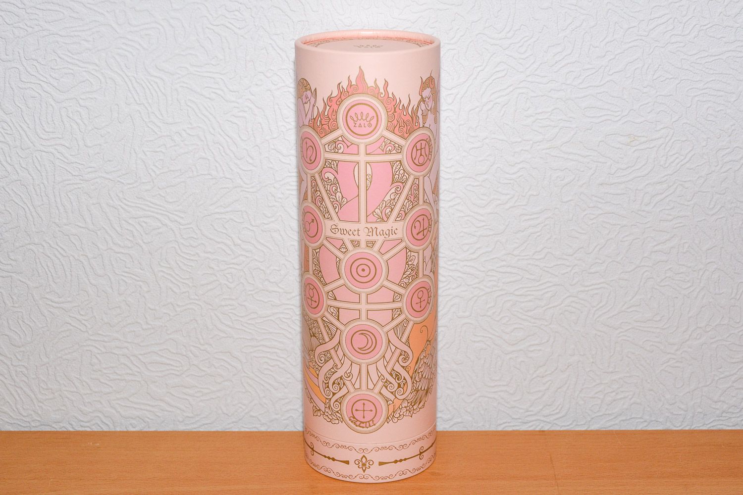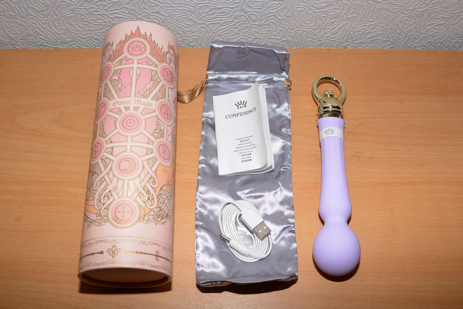 Allereerst de verpakking. De Confidence wordt geleverd in een kartonnen koker. Deze koker is schitterend bedrukt in Art Nouveau stijl met nog extra de tekst 'Sweet Magic.' In deze koker zit de vibrator, een handleiding, een oplaadkabel en een satijnen bewaarzakje. Op de achterkant van de vibrator zit het aansluitpunt voor de oplader, netjes afgewerkt met een siliconen clipje. De vibrator is gemaakt van siliconen, terwijl het gouden handvat van plastic is gemaakt.